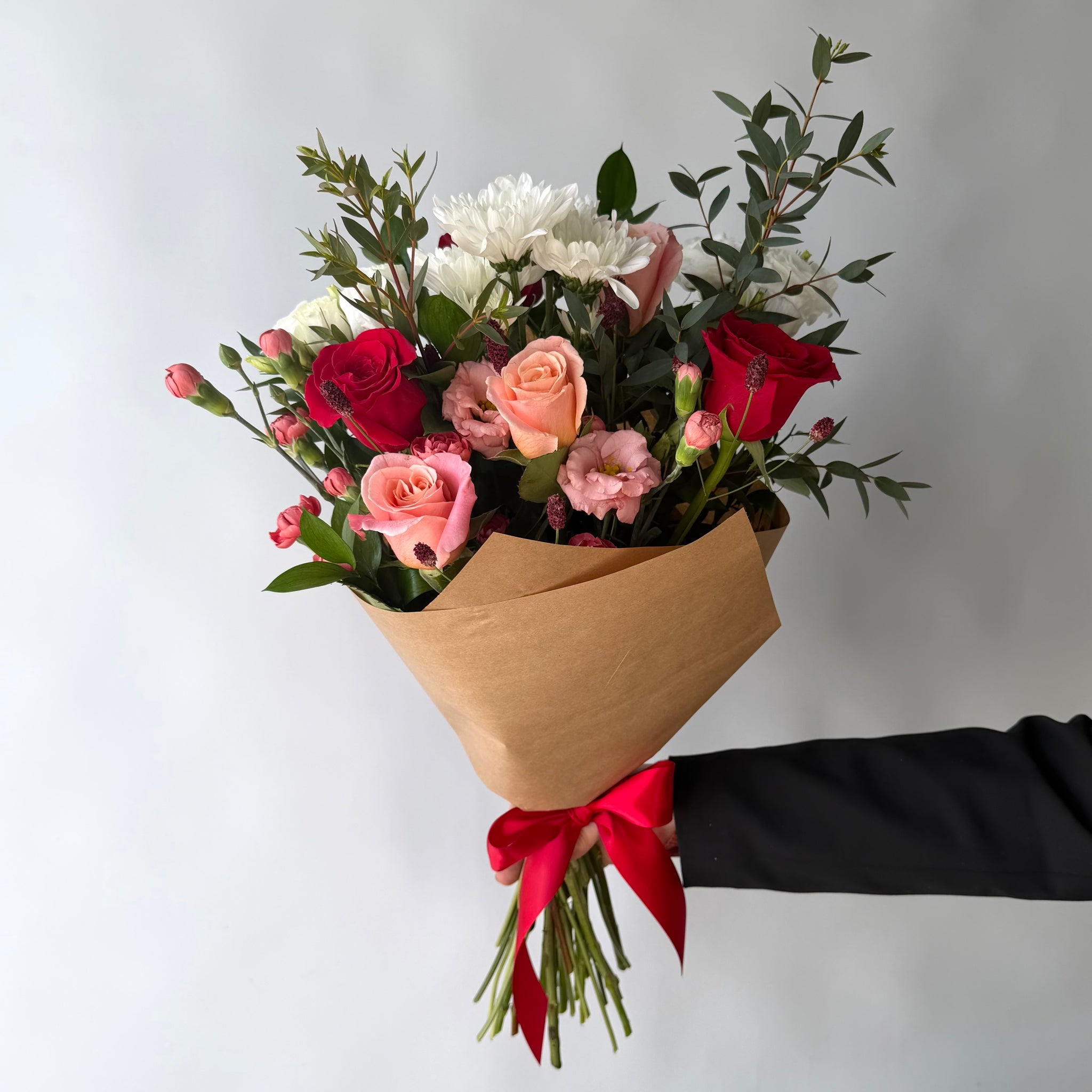 Recette florale du bouquet : roses, lisianthus, chrysanthèmes, eucalyptus parvifolia, œillets miniatures et sanguisorba